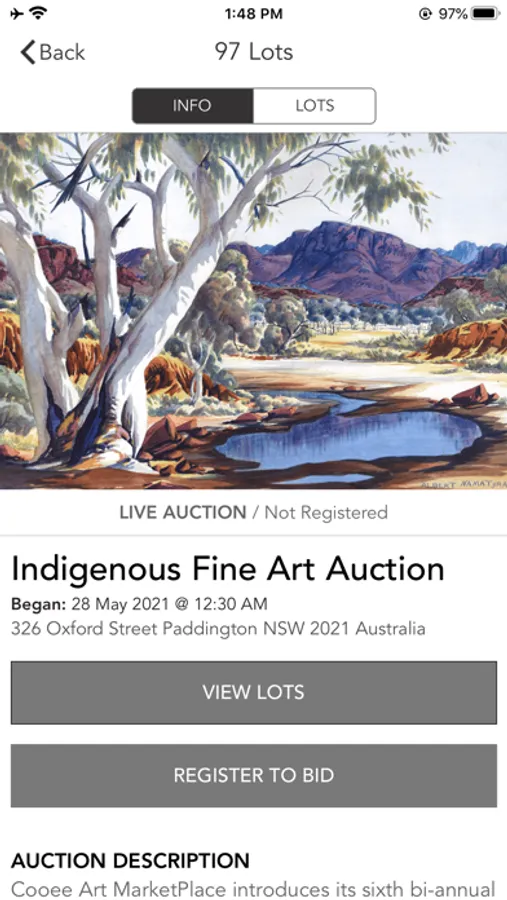 Cooee Art is Australia’s oldest Aboriginal art business and located at iconic Bondi Beach and Paddington in Sydney Australia. Cooee Art conducts multiple sales a year with focus on the finest Australian Indigenous Artworks. With the Cooee Art MarketPlace app, you can preview, watch and bid in our auctions from your mobile / tablet device. Participate in our sales while on-the-go and gain access to the following features: •Quick Registration •Following upcoming lots of interest •Push notifications to ensure you engage on items of interest •Track bidding history and activity •Watch live auctions Since it was established in 1981 in Paddington Sydney, Cooee Art has presented the finest Australian Aboriginal and Indigenous art through exhibitions and art events in Australia and overseas and represented many of the movement’s most seminal artists including Rover Thomas, Queenie McKenzie, Abie Jangala, and Kathleen Petyarre. Australian Indigenous Art MarketPlace formerly AIAM100 - Features collectable secondary market artworks for sale by private treaty and auction. Comprehensive artist profiles and market analysis. Up to date coverage of the Australian Indigenous art market. Cooee Art Marketplace is the most cost effective, informative and attractive alternative to buying and selling Aboriginal art at public auction. You can buy and sell art, sculpture and artefacts created by the most important Australian Aboriginal artists with no buyers premium or hidden costs. We guarantee unparalleled independent expert advice, certified authenticity, clear safe provenance, and excellent service. Every artwork offered for sale is supported by an authoritative profile on the artist; an in-depth market analysis for works sold at auction by the artist; statistics and graphs based on verifiable auction results since 1980; images and specifications for artworks that have achieved the 10 highest sales for the artist.