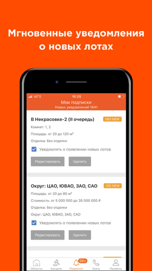 Приложение «Мой-Адрес» предназначено для удобного поиска квартир и нежилых помещений, а также для получения уведомлений о поступлении новых лотов в продажу.