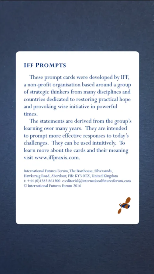 International Futures Forum (IFF) has been engaged in a programme of research and practice since 2001 to discover how to take more effective action in a world we do not understand and cannot control. These prompts are also available as a physical deck of cards which enjoy wide currency and have been used in diverse locations around the world – boardrooms, parliaments, communities, schools... We now offer the IFF Prompts App to access these cards on your smartphone.