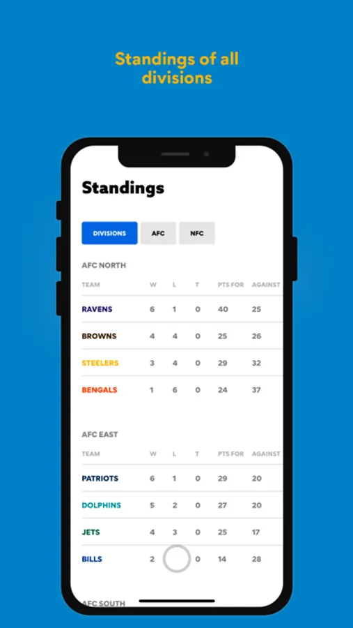 Find the standings for all divisions as well as the AFC and NFC standings.