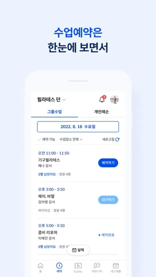 - 필라테스 던 이용하는 회원들은 이용 중인 스포츠 센터의 요가, 댄스, 필라테스 등 다양한 그룹운동 수업부터 1:1 퍼스널 트레이닝까지 구매한 회원권에 따라 어디서든 간편하게 예약할 수 있습니다.