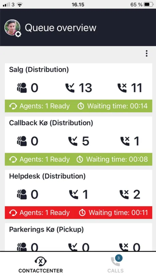 • få kø-overblik og se oplysninger om de telefonkøer du deltager i. Du kan se antal agenter, der er logget ind; hvor mange opkald, der venter; hvor lang den gennemsnitlige kø-tid er og hvor mange opkald, der hhv. er behandlede og ubehandlede.