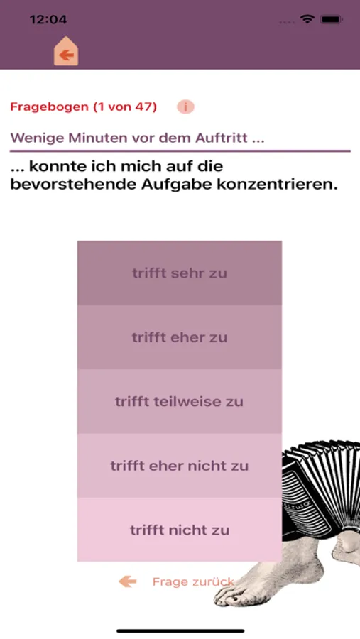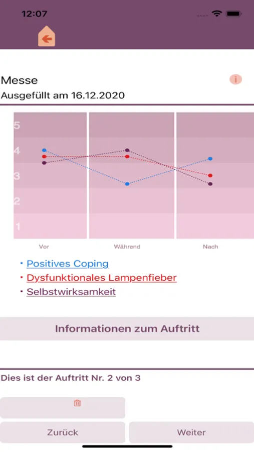 Stage:Cool basiert auf dem validierten Fragebogen zum Auftritt für Musiker (FZAM, Spahn und Nusseck (FIM)). Der Schwerpunkt liegt auf dem Erleben von Aufregung, dem Umgang mit Lampenfieber und der Selbstwirksamkeit bei einem Auftritt. Die Fragen beziehen sich auf die Zeitpunkte kurz vor dem Auftritt, während des Auftritts und direkt nach dem Auftritt. Sie können in der Auftritts-App auch jeden einzelnen Auftritt nach musikalischen Kriterien bewerten und Notizen zur jeweiligen Auftrittssituation festhalten. Die Stage:Cool bietet Ihnen die Möglichkeit, ein Verzeichnis Ihrer Auftritte anzulegen und sie im Nachhinein einzeln, als Mittelwerte oder in grafischer Aufarbeitung im Überblick zu betrachten.