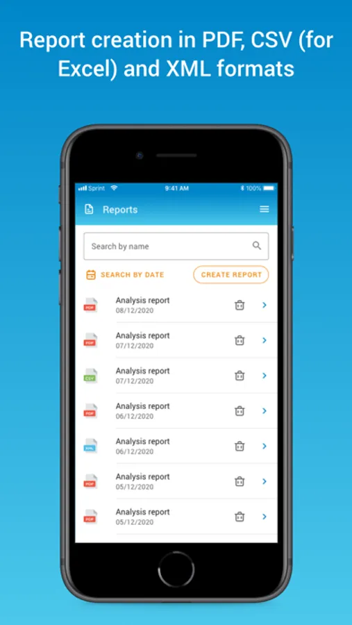 - Report creation in PDF, CSV (for Excel) and XML formats