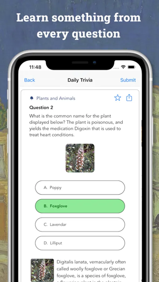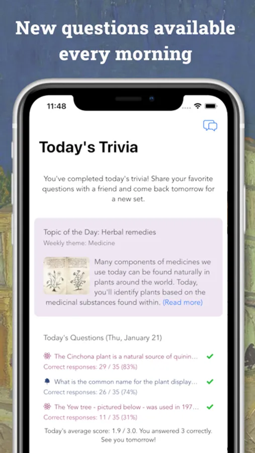 We love hearing suggestions! You can send us an email (dailytrivia.feedback@gmail.com) or use our in-app suggestion box. All of our questions are hand-written and we’d be glad to feature a topic you are passionate about.