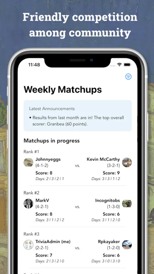 (3) Friendly competition: Participation in our community league is encouraged but optional! Each week, you’ll be matched up with another trivia player from around the world. Climb the ranks to reach the Champion League, featuring our top players.