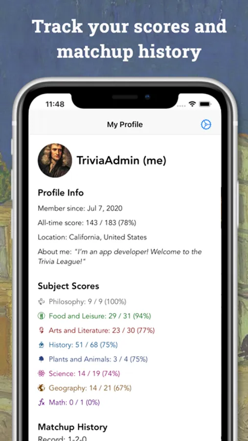 - Review questions: Your trivia profile includes stats for each subject as well as a section to review missed questions.