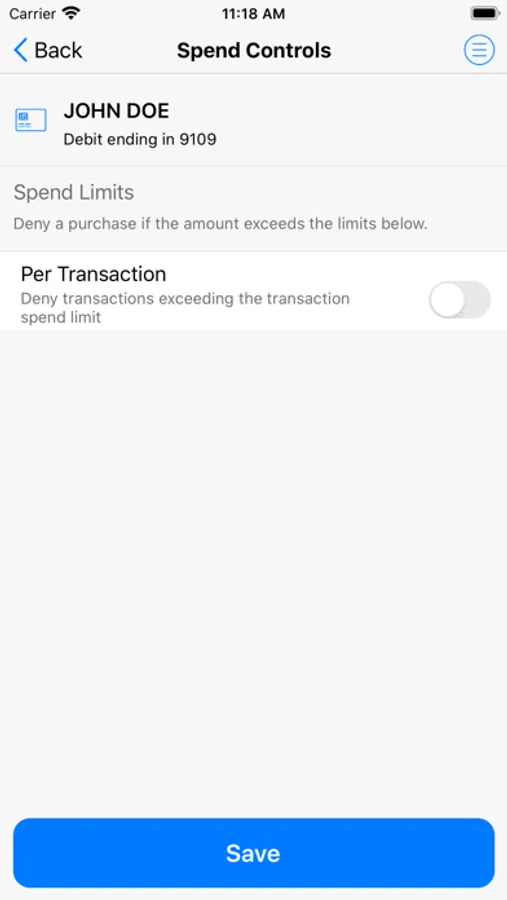 Set spending limits to decline transactions above your thresholds. Monitor activity by category such as gas stations and restaurants, and by type: in-store purchases, e-commerce transactions and ATM transactions.