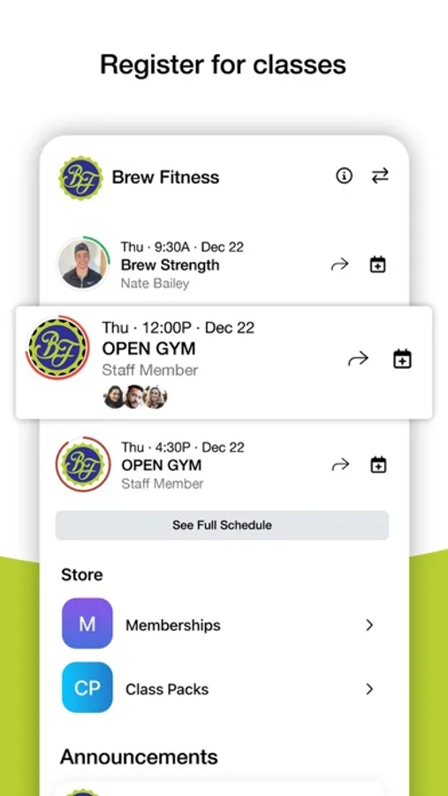 The Brew Fitness app provides class schedules, class and session booking, membership options, events, social media platforms and links for Brew Fitness members.