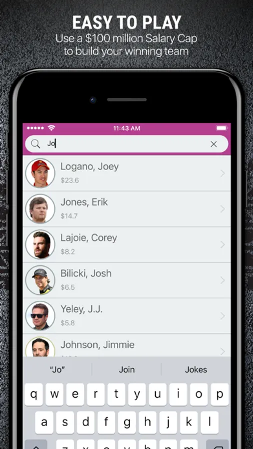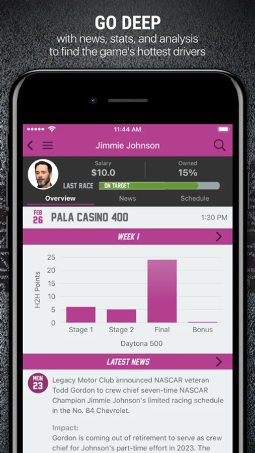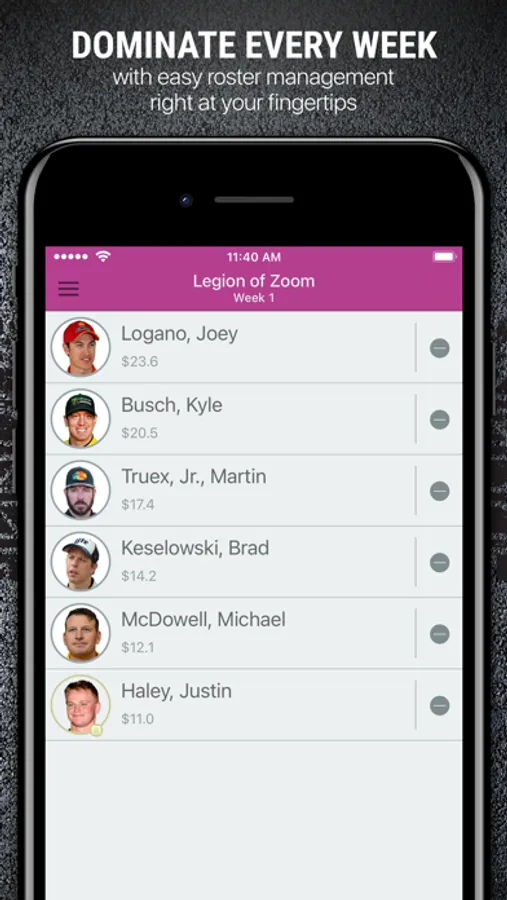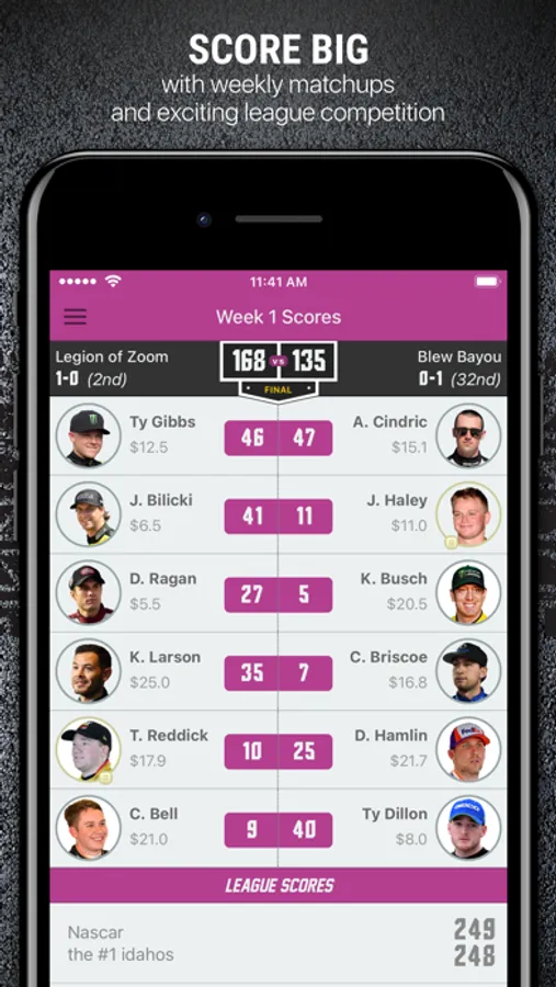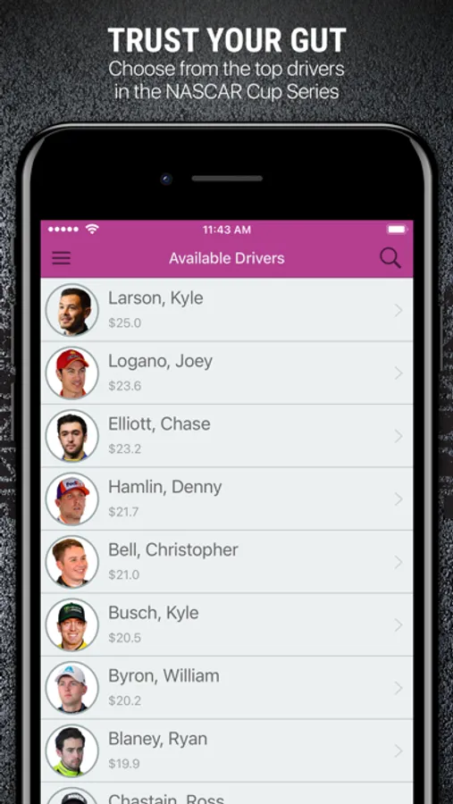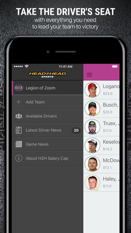 Using a salary cap of $100 Million, pick a team of 6 professional race car drivers that you think will score the most points each week. Points for each driver are based on actual Cup Series points earned by each of your drivers, plus bonus H2H Fantasy points to pull away from your competition.