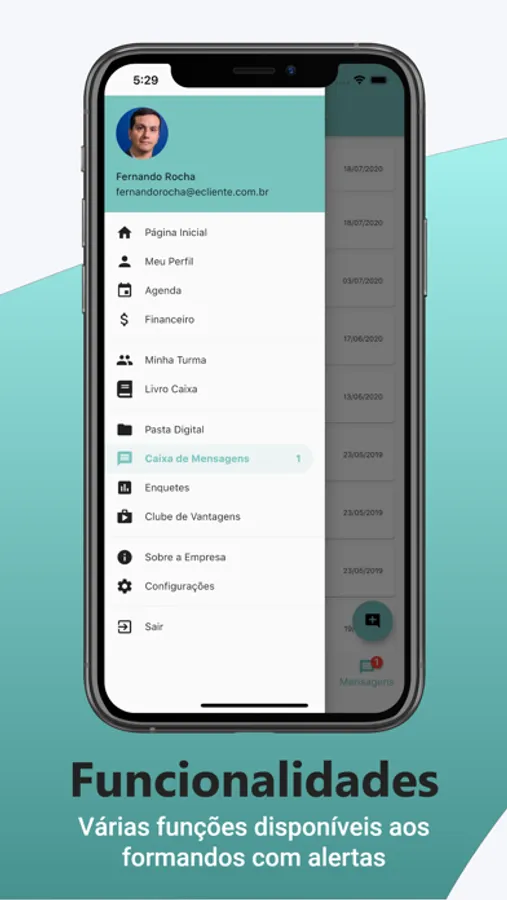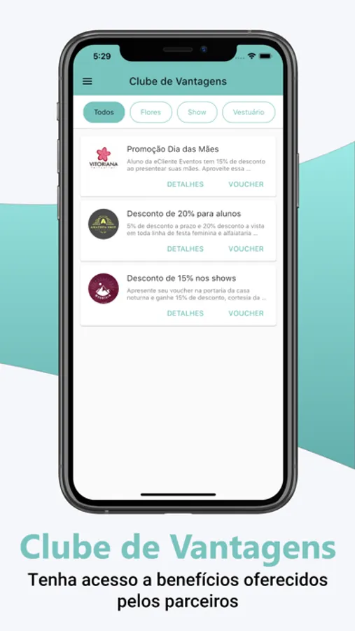 - Clube de vantagens (lista das promoções disponíveis e voucher)