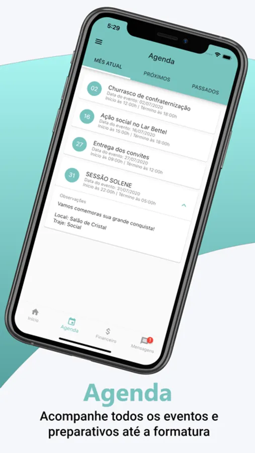 - Agenda dos eventos da empresa (eventos do mês, próximos e passados);