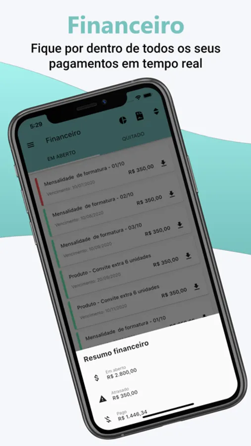 - Gestão financeira (cobranças abertas com linha digitável e pagamentos realizados)