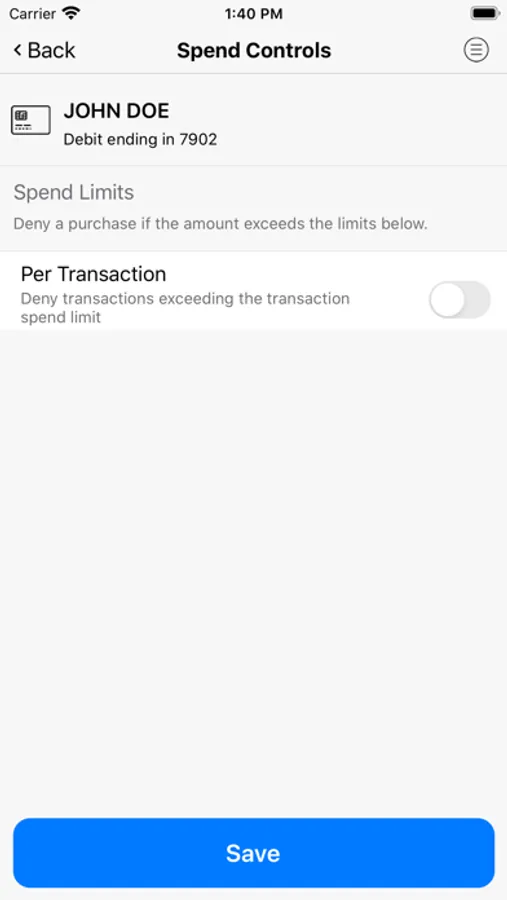 Set spending limits to decline transactions above your thresholds. Monitor activity by category such as gas stations and restaurants, and by type: in-store purchases, e-commerce transactions and ATM transactions.