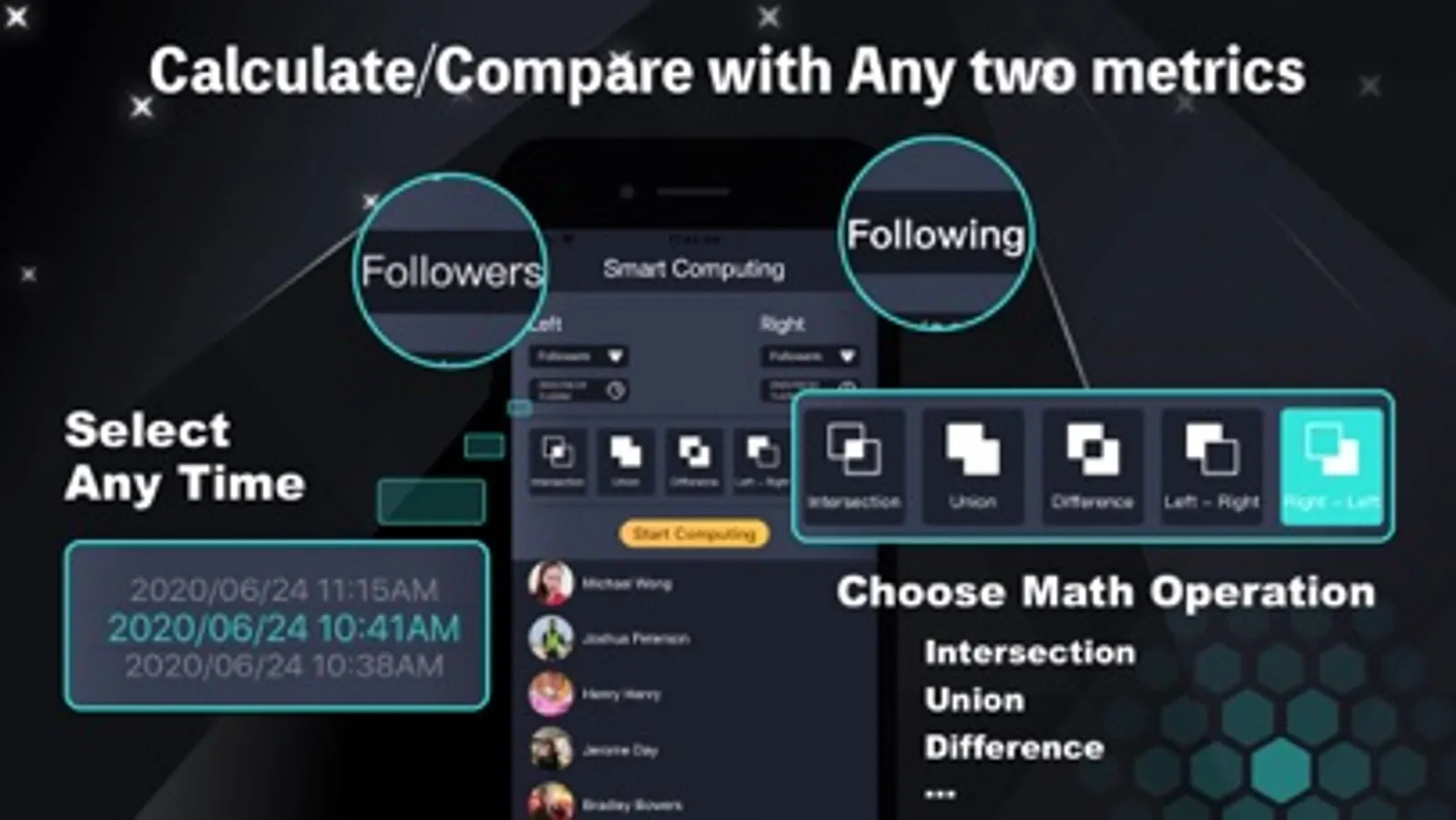 6. If you want to know mutual friends. Choose "following" on left. Choose "followers" on right. Select the time you want to check. Click "Intersection". You can get people both in your followers and following.