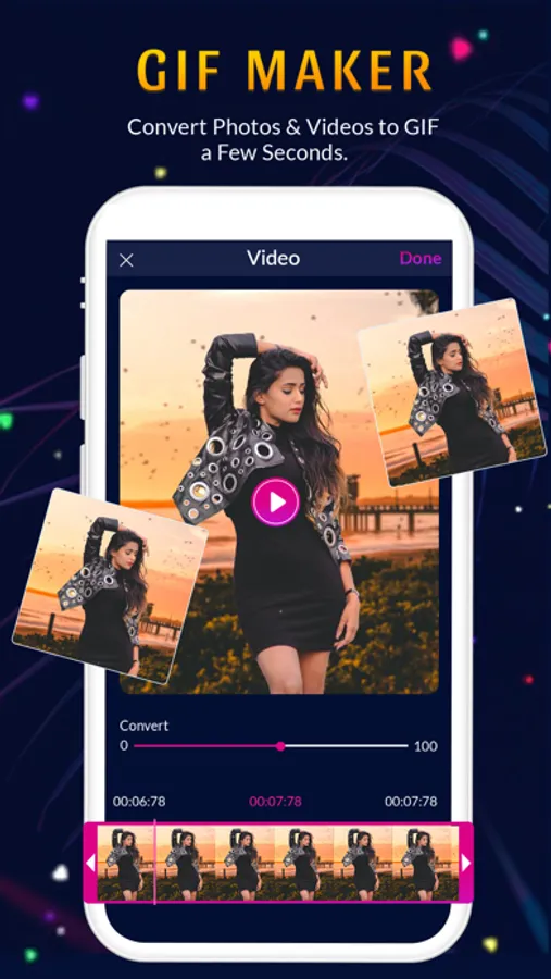 Viva video maker Video is the best Gif maker app that fits right in your pocket. This video to gif editor allow you to edit a existing gif or make gif files from photos and video files. You can create animated gif with music and share on social media.Viva video maker. Edit video with music, emoji, stickers, text and convert video to gif. You’ll be able to create photos to gif from gif camera selfie.photo video Maker The video to gif maker is only gif creator app that can crop your gif and let you edit your gif files by gif tools.Birthday photo video Maker, photo video Maker