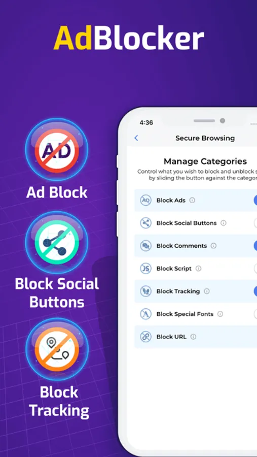 - Secure Browsing - Blocks ad, analytics, social & content trackers for secure browsing.