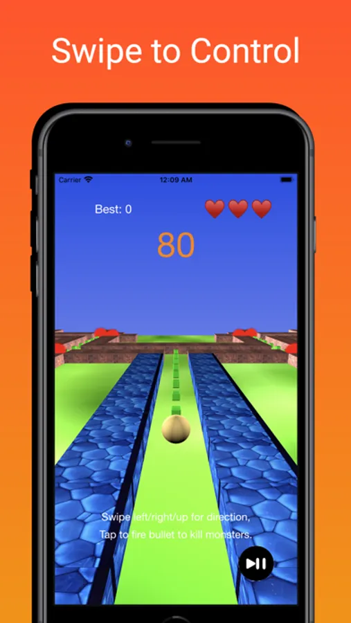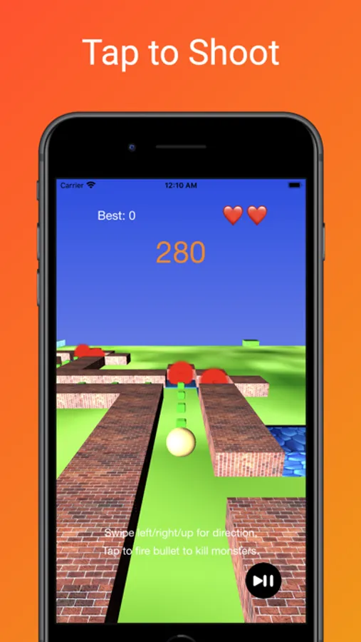 Swipe left/right/up to change ball movement direction. Try to avoid monsters and fireball. Tap to fire bullet.