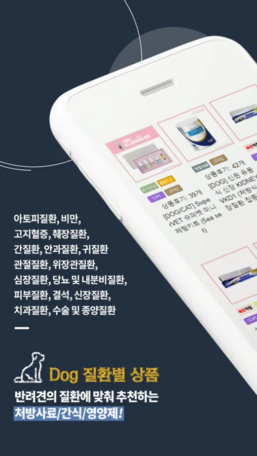 - 반려견의 질환에 맞춰 추천하는 처방사료, 간식, 영양제!