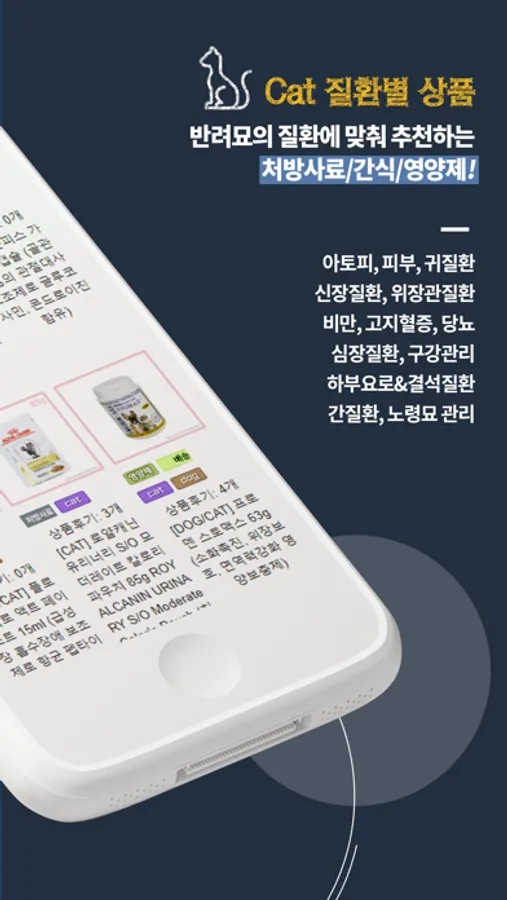 - 반려묘의 질환에 맞춰 추천하는 처방사료, 간식, 영양제!