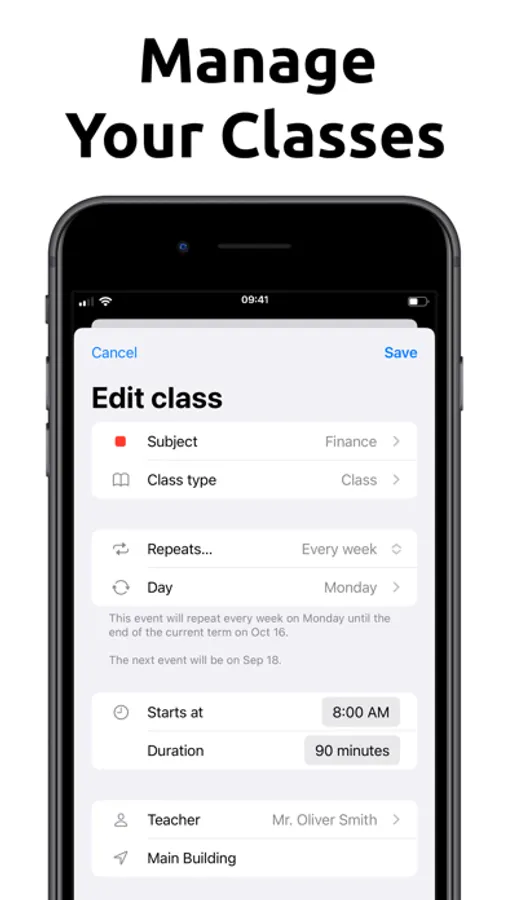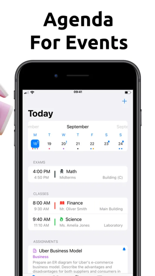 You can easily create and manage your classes, assignments, and exams. All will be shown in your Agenda where you can find your daily plan. From there, you can manage your events or cancel a single class in case of emergency events.