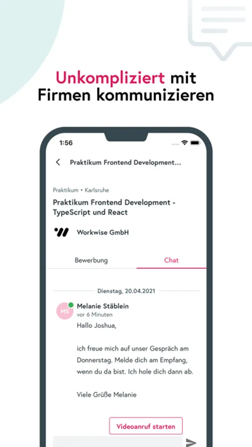 - Einfache Kommunikation: Über unsere Plattform kannst du dich schnell und unkompliziert mit dem Unternehmen austauschen. Lange Wartezeiten auf die Antwort des Unternehmens waren gestern.