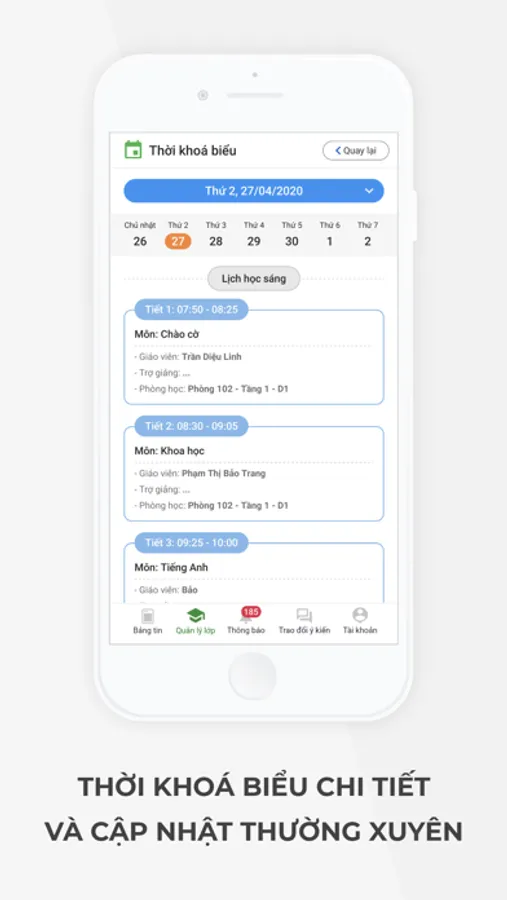 - Quản lý thời khoá biểu, thực đơn, bảng điểm của học sinh.