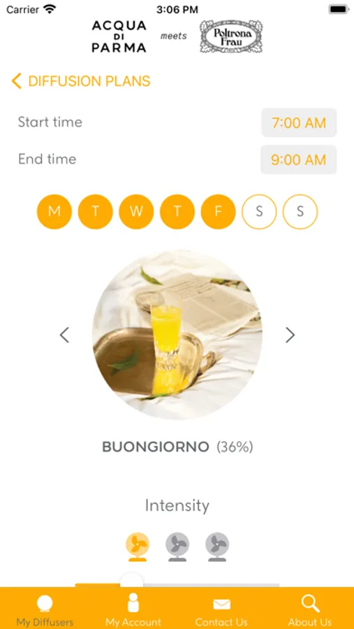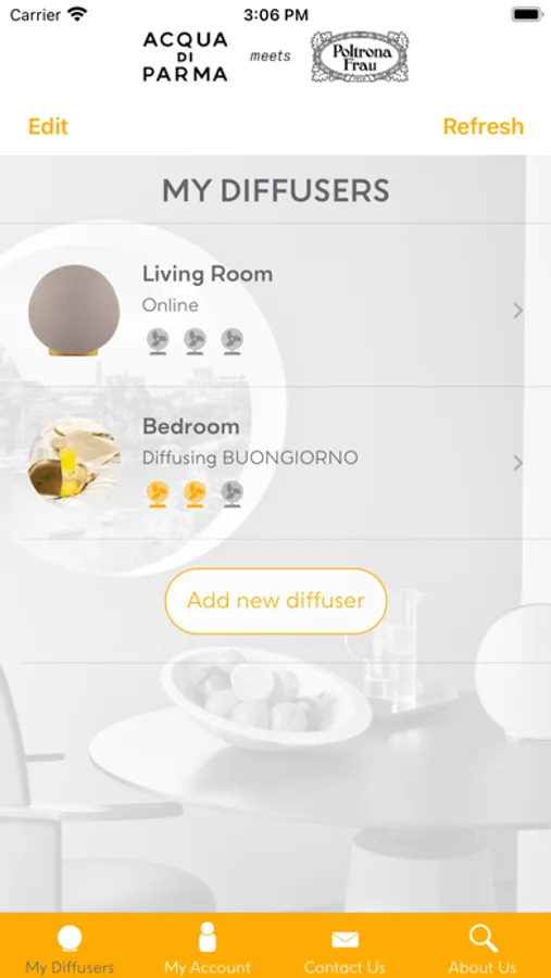 This app works with the Acqua di Parma x Poltrona Frau Smart Home Diffuser device. The Smart Home Diffuser is an innovative multi-sensory home fragrance experience shaped by design, technology, and expert Italian craftsmanship. The AIROUND app is an innovative tool to manage and control the Diffuser via wireless connection.