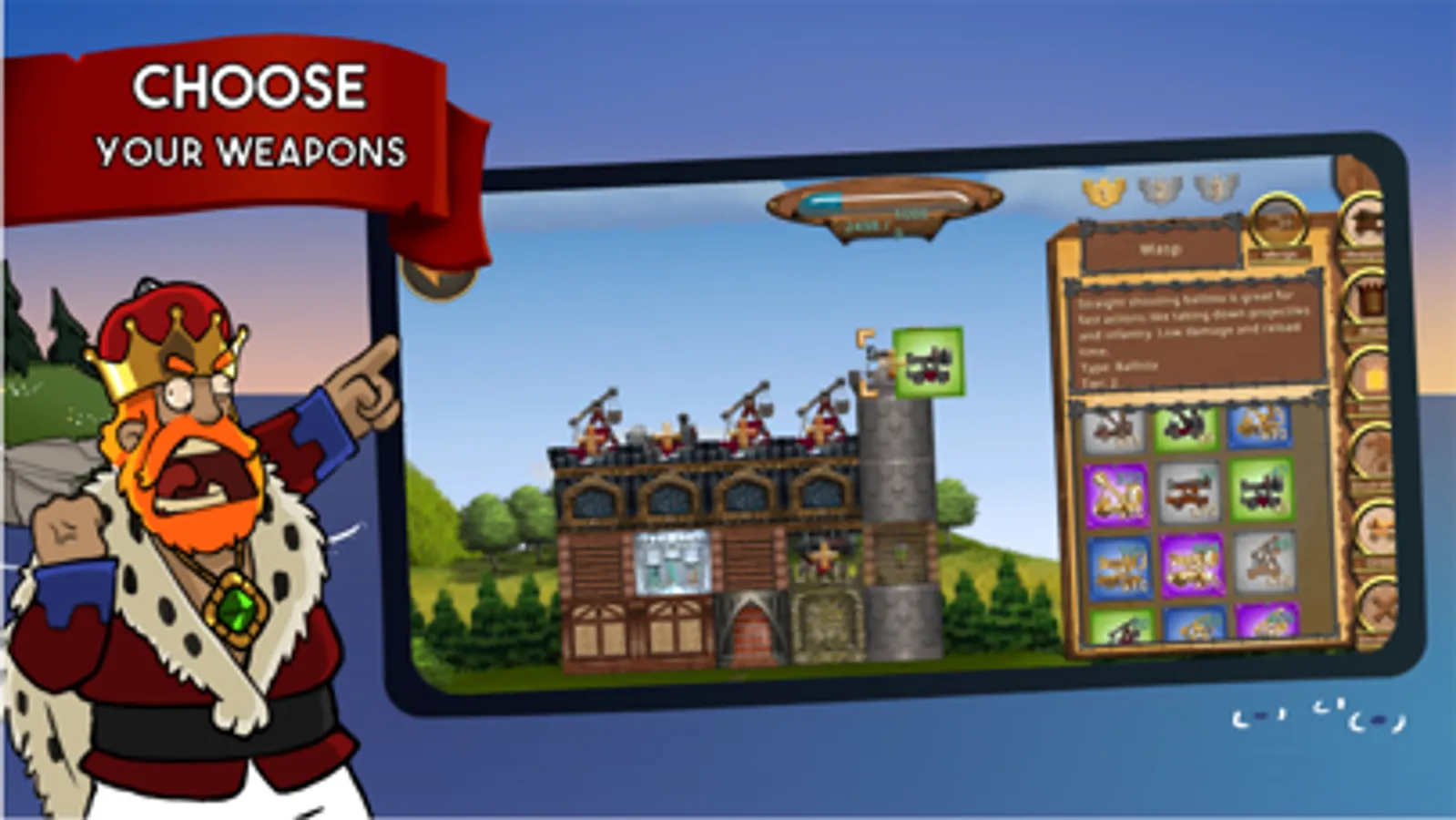- Build your own personal Castle, choosing which strategy and tactics to focus on and destroy your enemies with powerful weapons: ballista, catapult, trebuchet, cannon,…