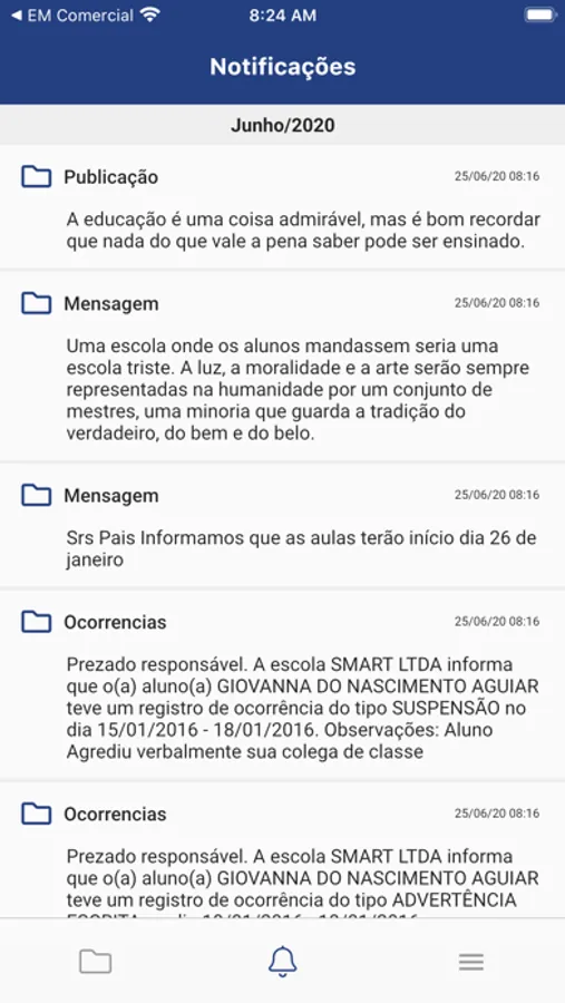 Avisos, ocorrências escolares, declaração de pagamentos, enfim....