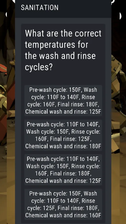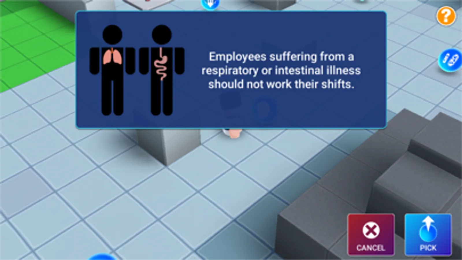 Sanitation Master: Take the four sanitation lessons (Personal Hygiene, Hand Washing, Proper Glove Use and Contact Surfaces) and put your new knowledge to the test! To beat the different challenges, you will need to group correct information and discard false information. Pay close attention and win the tests with the best scores so you can get the Sanitation Master Trophy!