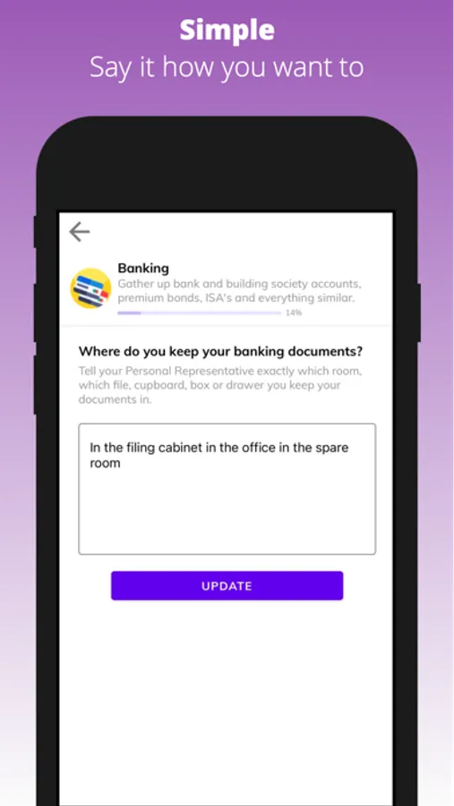 Verat leads you by the hand through the difficult issue of explaining clearly, to your executor or personal representative, your finances and assets. Verat can go alongside your will to help describe your estate. However, it does not need you to have a will in place for it to help. By completing Verat you may save your personal representative hours, and more likely days, of difficult paperwork at an emotionally challenging time. It can function as part of a 'letter of wishes' to help your administrator. Verat is straightforward to use and flexible enough to capture valuable information about your finances, housing, vehicles, funeral arrangements, those friends and family who may need to know about your funeral, heathcare providers, your internet accounts and much more; all the things that make up a real, complex life. All your personal data stays personal to you and whoever you choose to share it with. Verat makes it simple for you to share different aspects of your life quickly with the person you are asking to be your executor. Verat will not ever have access to, or store, your data. While completing Verat is your way of paying forward to your executor, it can help you gain a clear picture of your finances that could help you tidy up and rationalise your outgoings.