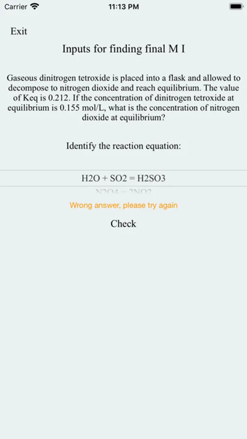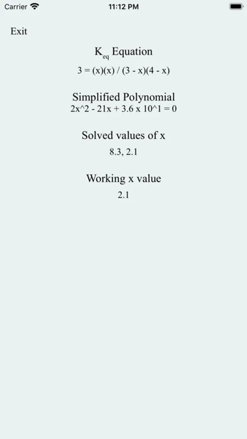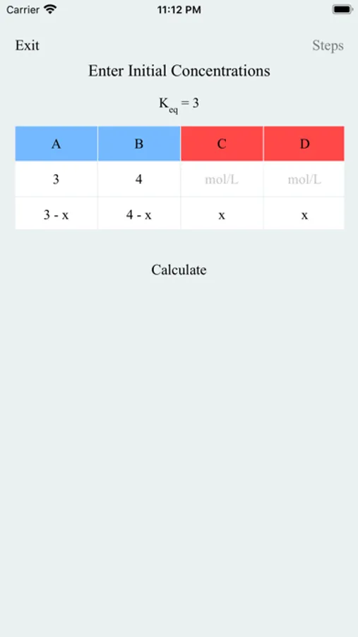 Calculate the concentrations at the equilibrium of a reversible chemical reaction using this app! Simply enter in the chemical equation, enter the Keq value, and then enter in the initial concentrations of each compound. This app can also backward calculate for the Keq value by simply leaving the Keq field blank. This app includes the main steps for all calculations.
