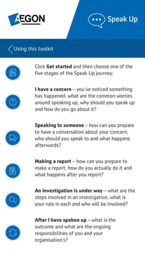 The Aegon Global Speak Up App helps Aegon employees and partners worldwide to raise a concern about unlawful, unethical or other improper behaviour in the workplace.