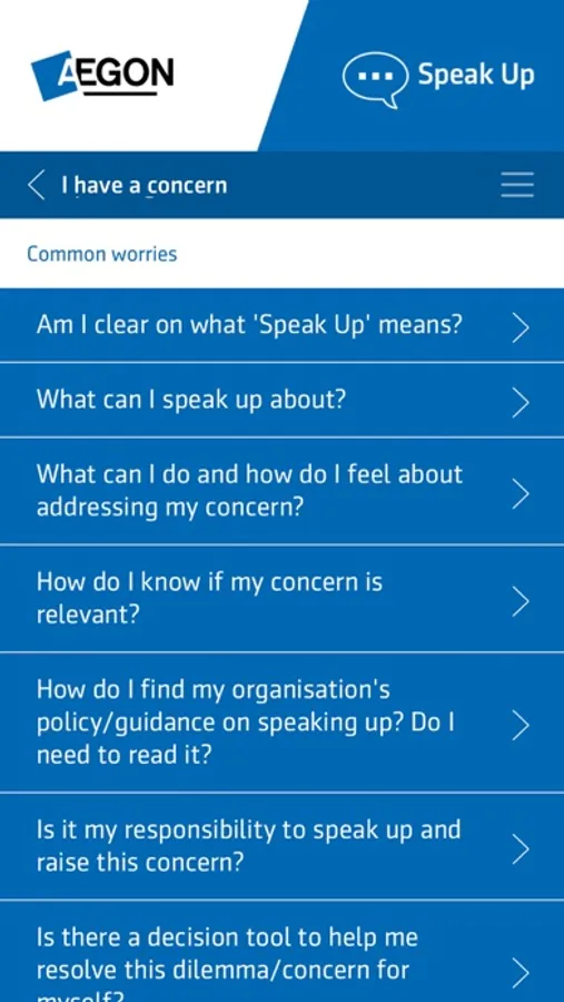 The Aegon Speak Up App is primarily intended for employees of Aegon. However, we do recognize others may wish to report concerns to us about our work or conduct. They are also welcome to use this App for guidance and support.