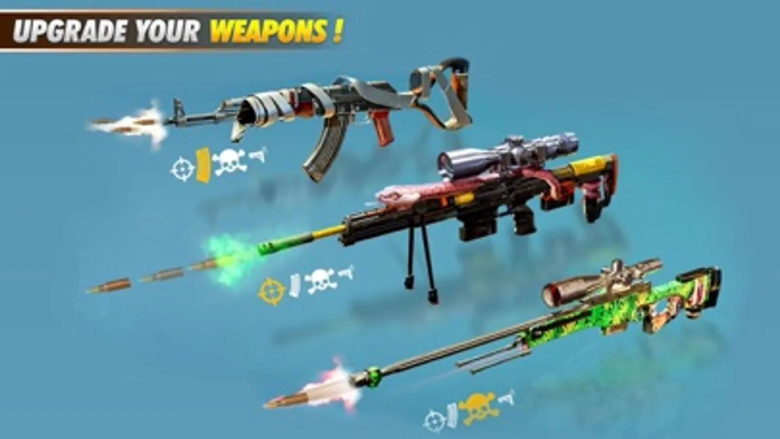 Explore gun shooting games store and choose your weapons from a variety of options including sniper rifles, assault rifles, AK47s, shotguns and hand grenades. Timely upgrade your weapons and gear to become a strong surviving sniper 3D shooter and confront more dangerous enemies.