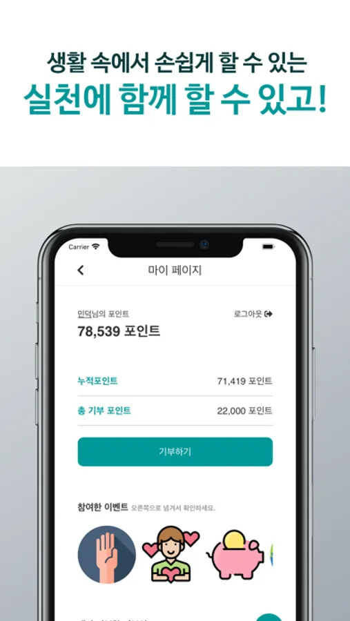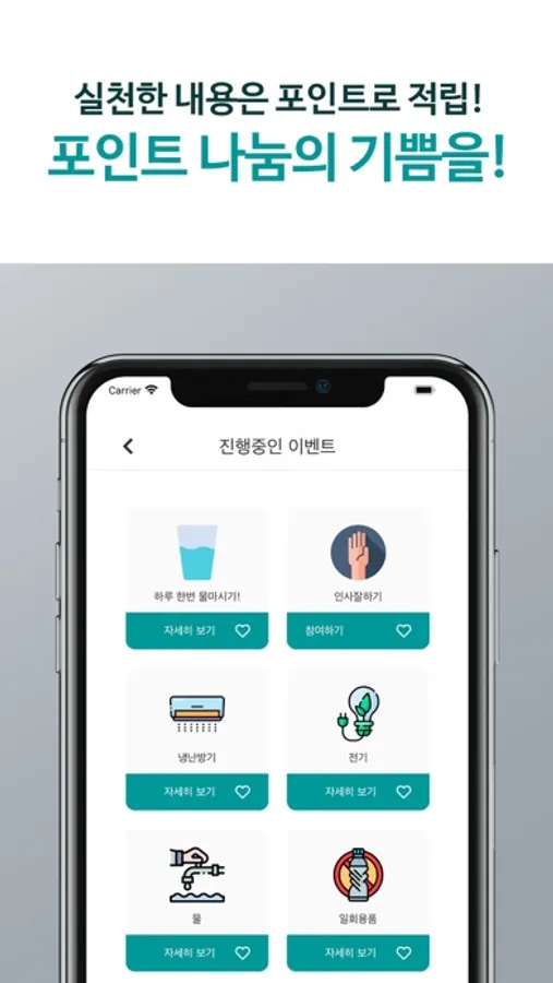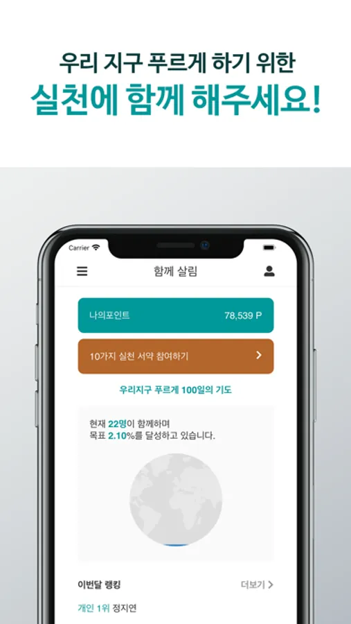 ‘함께살림’은 생활 속에서 환경을 보호할 수 있는 다양한 방법을 10가지 부분으로 나누어 알려드리고, 매일 실천 여부를 체크할 수 있습니다. 사용자는 실천 서약을 준수하여 환경 보호에 동참하고 수행 후에는 포인트를 획득하여 다른 회원 혹은 소속된 그룹 간 순위를 확인할 수 있습니다.