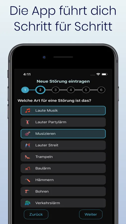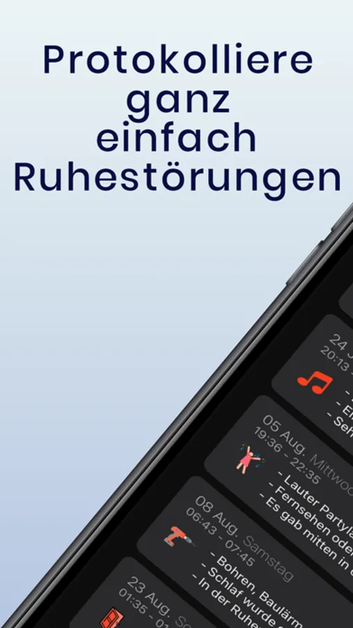 Protokolliere jetzt ganz einfach Ruhestörungen und erstelle schnell ein richtiges Lärmprotokoll. Sende es direkt an deinen Vermieter oder Anwalt. Und das machst du ganz einfach, indem du ein paar Fragen in der App beantwortest - ohne langweilige Formulare.