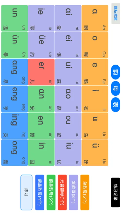 学习韵母是一款面向学习中文,普通话人群,能够让用户学习认识最基础的韵母声节的app。