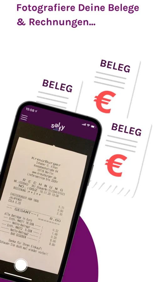 Fotografiere Deine Belege, Rechnungen und Verträge mit der Salfy App und lade diese hoch.