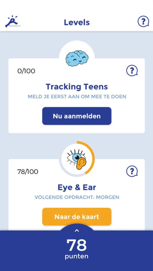 Via deze app kunnen Generation R deelnemers meedoen aan extra onderzoeken. Door hieraan mee te doen help je Generation R met onderzoek naar emoties, gehoor, ogen en tanden. Er zijn verschillende levels waar je aan mee kunt doen. Je kunt zelf kiezen met welk level je begint, en je mag ze ook allemaal tegelijk doen. Tracking Teens duurt één week, waarbij je elke dag vijf keer een paar korte vragen in gaat vullen over waar en met wie je bent, en hoe je je op dat moment voelt. Door deze vragen over je emoties een paar keer per dag te beantwoorden kunnen de onderzoekers een goed beeld krijgen van de emoties van jongeren op verschillende momenten van de dag. Het Eye & Ear level duurt vijf weken met twee maal per week een korte vragenlijst en een aantal metingen via je telefoon waar je niets voor hoeft te doen. In het Eye onderdeel vragen we hoeveel je buiten bent geweest en wordt je schermtijd, de afstand van je ogen tot het scherm, je schermhelderheid, en de lichtomstandigheden via je telefoon gemeten. Zo kunnen we onderzoeken of deelnemers met veel smartphone gebruik vaker bijziend zijn. In het Ear onderdeel meten we de blootstelling aan geluid via oordopjes of een koptelefoon via de mobiele telefoon. Daarnaast vragen we of je naar een feestje bent geweest, hoe hard de muziek daar stond, en of je na dit bezoek last had van een piep in je oren. Zo kunnen we het risico op gehoorschade door blootstelling aan harde geluiden en muziek onderzoeken. Het Teeth level duurt drie maanden, waarbij je twee keer een korte vragenlijst invult over jouw mondgezondheid en laatste tandartsbezoek. Op die manier kunnen we goed in kaart brengen hoe Generation R deelnemers hun eigen mondgezondheid ervaren, en hoe vaak en om welke reden de tandarts wordt bezocht. Alles wat je invult en wat gemeten wordt via de app, wordt alleen voor het onderzoek van Generation R gebruikt. Alle gegevens die de app meet worden op een veilige plek opgeslagen. Uiteindelijk worden jouw gegevens gekoppeld aan een code en niet aan jouw naam, zo kunnen wij alle informatie veilig en anoniem verwerken en gebruiken voor het onderzoek. Bij elk level kun je een aantal punten verdienen om te sparen voor een kortingscode. Als je alle levels doorlopen hebt, en je hebt minimaal 80% van alle punten behaald ontvang je 30% korting bij Escaperoom Breakout Rotterdam!