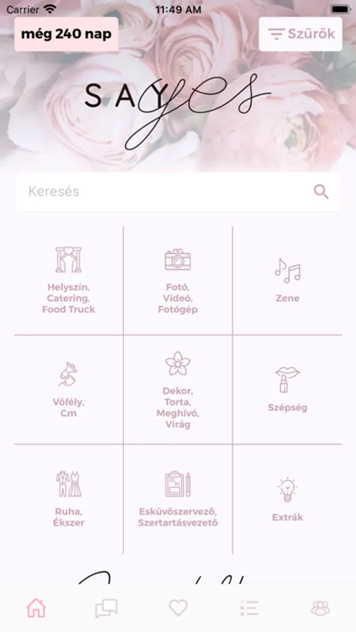 A Say Yes Magyarország első, ingyenesen letölthető esküvőszervező mobilapplikációja, amelyben a Menyasszonyok megadhatják a Nagy Napjuk tervezett dátumát, melynek alapján a Say Yes listázza nekik az aznap szabad Szolgáltatókat. Ezzel időt és energiát spórolunk mindenkinek, hiszen a Menyasszonyok azonnal látják hogy a Nagy Napjukon ki szabad és ki nem.