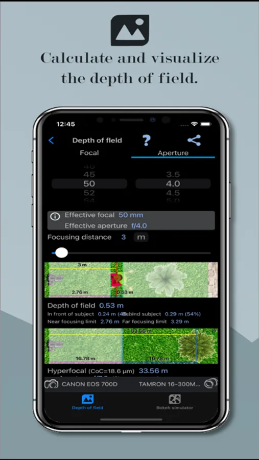 - Calculate the depth of field, hyperfocal and simulation of Bokeh