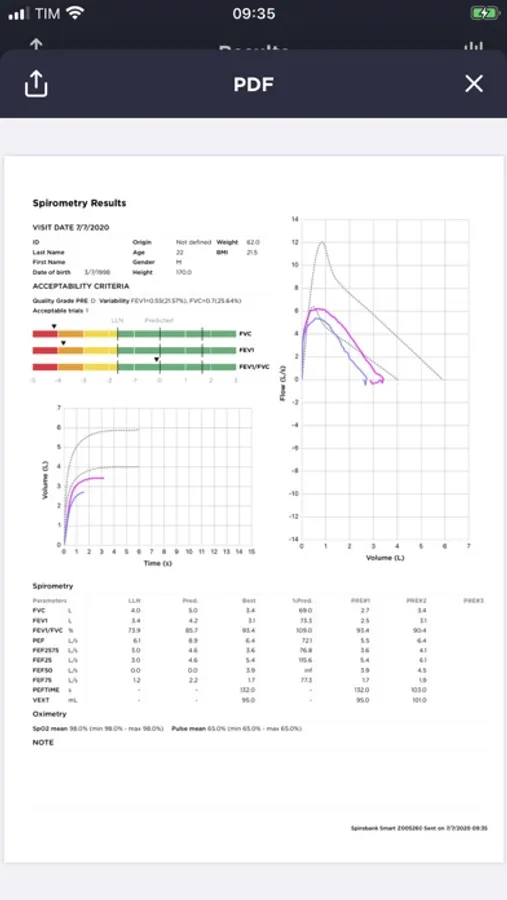 - Complete PDF printout including: Flow/Volume and Volume/Time curves (Best 3 trials), quality control grade, acceptable trials, variability of FEV1 and FVC, pictograms.