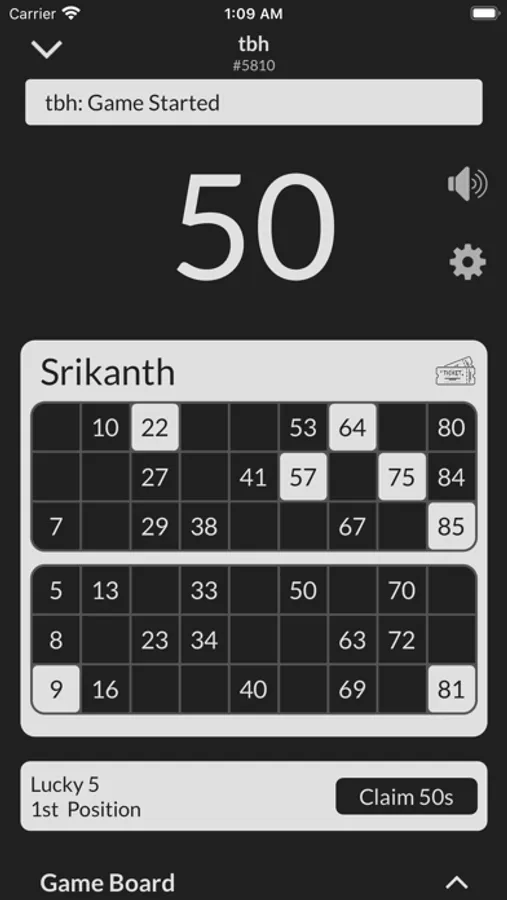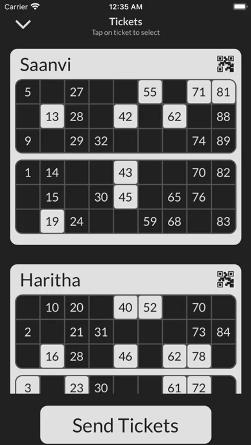 7. Tap on "Create Game" to create game with players. All tickets will be displayed upon game creation.