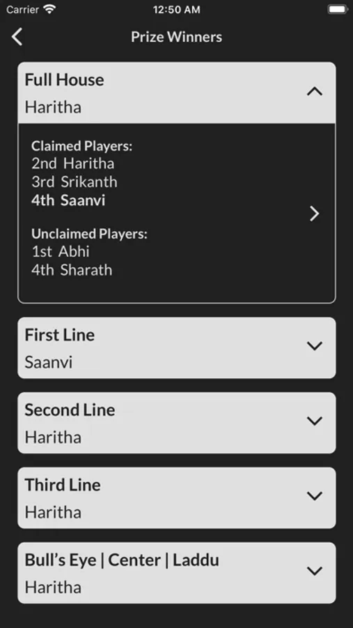 App displays winners information for each dividend with winning positions and claim statuses. Prompts the first winner for every dividend in game dashboard.