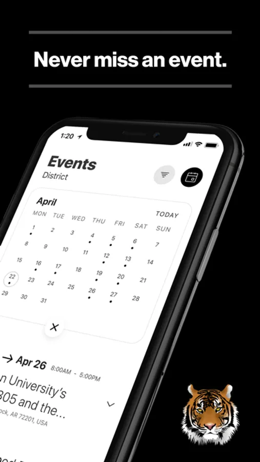The event section shows a list of events throughout the district. Users can add an event to your calendar to share the event with friends and family with one tap.