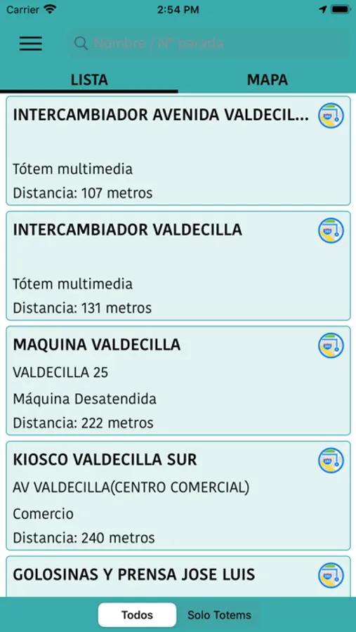 El aplicativo muestra en pantalla el listado de puntos de recarga de saldo/venta de tarjetas de transporte más cercanos al punto de la cuidad en el que se encuentre el usuario (requiere tener activado el gps del terminal).