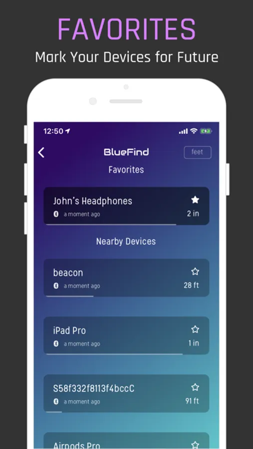 BlueFind shows you list of nearby Bluetooth devices with their distance and signal strength. Device detail shows graphical signal strength to easily locate your device. If your device is out of range, you can set a notification on it. BlueFind will notify you when it sees that device again. This works even when BlueFind app is closed.