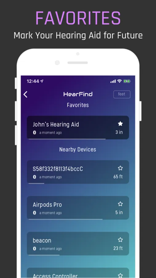 HearFind intelligently detects hearing aids and also shows you list of nearby Bluetooth devices with their distance and signal strength. Device detail shows graphical signal strength to easily locate your hearing aid. If your hearing aid is out of range, you can set a notification on it. HearFind will notify you when it sees your hearing aid again. This works even when HearFind app is closed.